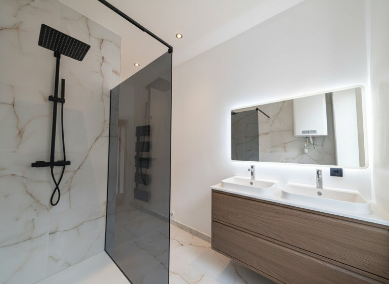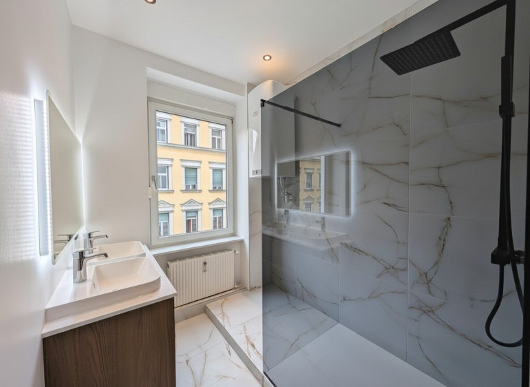 - Badezimmer: Mit Fenster, neuem Doppelwaschbecken inklusive Unterschrank und einer modernen Walk-in Dusche (Regenbrause und Handtuchheizkörper).