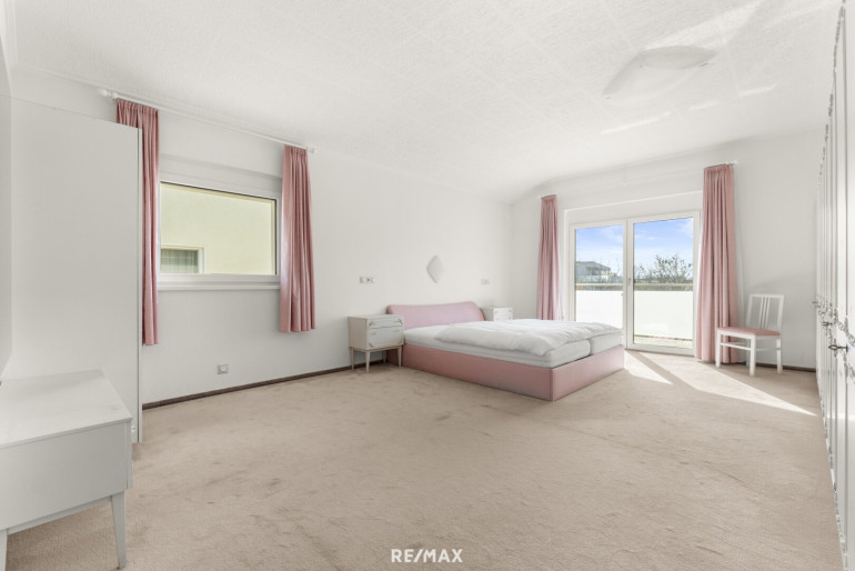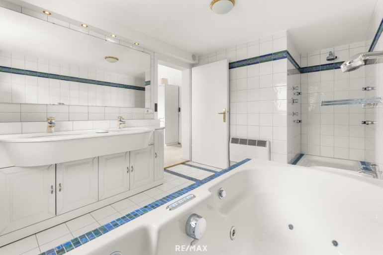 Die Raumaufteilung ist durchdacht und bietet sowohl gemütliche Rückzugsorte als auch großzügige Gemeinschaftsbereiche. Im Obergeschoss befindet sich ein großes Schlafzimmer mit Zugang zum Südbalkon sowie ein hochwertig ausgestattetes Badezimmer mit Whirlpool-Badewanne, Dusche, Bidet und Doppelwaschbecken. Ergänzt wird die Etage durch einen Wäscheraum, ein separates WC sowie einen Vorraum. Über einen Treppenaufgang gelangen Sie in ein weiteres, kleines Zimmer mit Glasfronten.