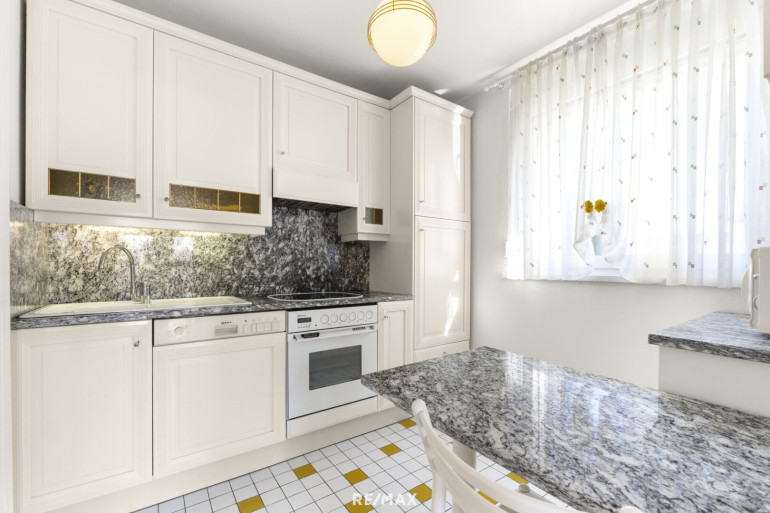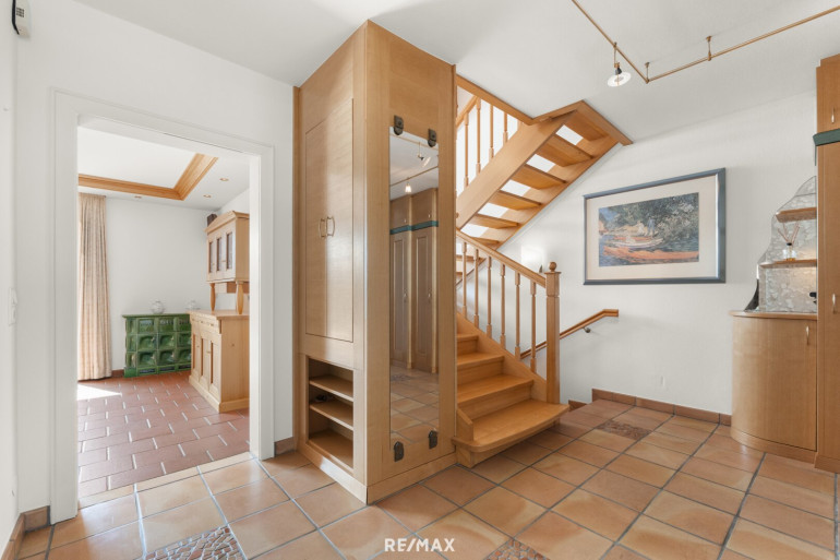 Der Außenbereich bietet eine kleine Gartenfläche, eine großzügige Terrasse sowie zwei sonnige Balkone mit herrlichem Ausblick. Das Grundstück ist überschaubar und pflegeleicht – ideal für alle, die das Leben im Grünen genießen möchten, ohne viel Zeit in Gartenarbeit zu investieren. Zusätzlich stehen eine Garage im Untergeschoss mit elektrischem Tor sowie ein Carport zur Verfügung.