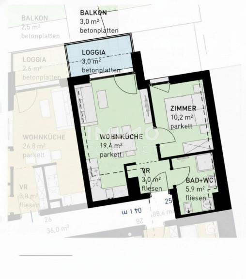 - Jede Wohnung mit privater Freifläche (Loggia, Balkon, Terrasse, Eigengarten)