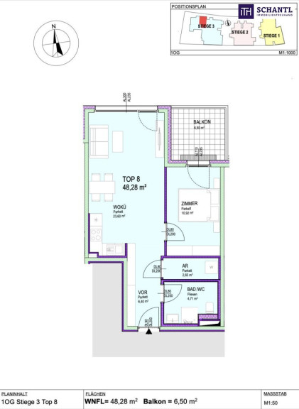 Wohnfläche: ca. 48,28 m² + Balkon: ca. 6,50 m² + Kellerabteil