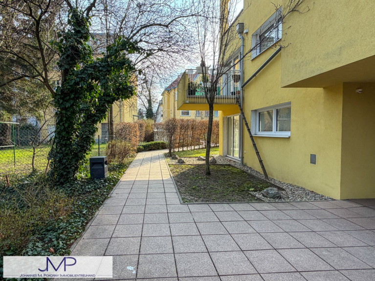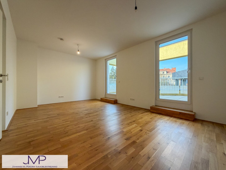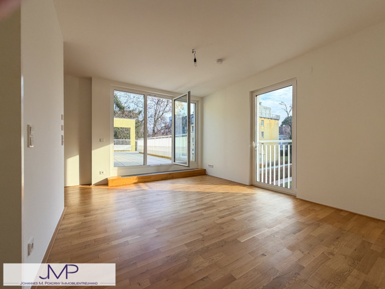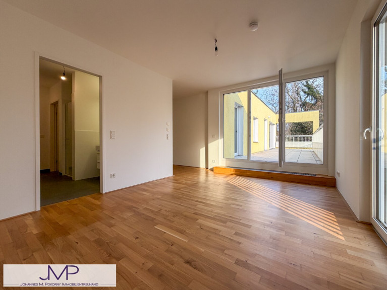 Von der Wohnküche aus gelangt man direkt auf die südlich ausgerichtete Terrasse mit einer Fläche von rund 32 m², die viel Sonne und Platz zum Entspannen bietet. Auch das Schlafzimmer verfügt über einen direkten Zugang zu dieser Terrasse.