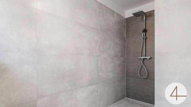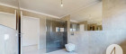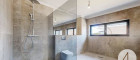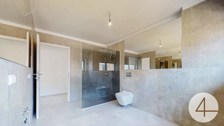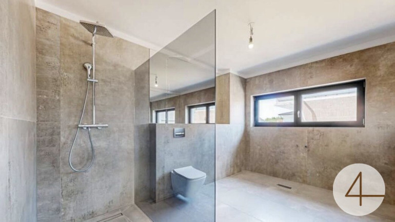 Ein modernes Badezimmer mit Walk-In-Dusche, hochwertige 3-fach verglaste Kunststoff-Alufenster sowie außenliegende Rollläden unterstreichen den gehobenen Ausstattungsstandard.