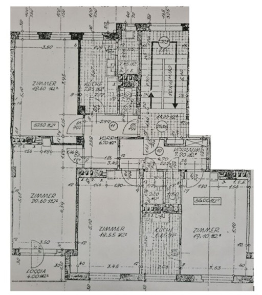 Vorzimmer, Wohn-Esszimmer, Extraküche, 3 getrennt begehbare Zimmer, ca. 4 m2 Loggia, Waschküche, 2 Badezimmer, 2 WCs und Kellerabteile