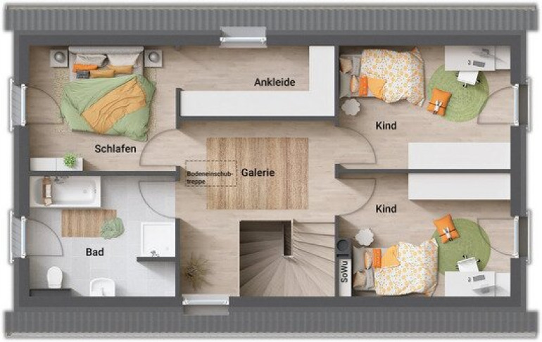 Das Obergeschoss ist perfekt auf Familien zugeschnitten: Zwei helle Kinderzimmer, ein modernes Badezimmer sowie ein großzügiges Elternschlafzimmer mit begehbarem Kleiderschrank schaffen Raum für Komfort, Rückzug und individuelles Wohlfühlen.