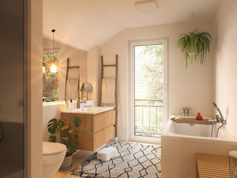 Das Obergeschoss ist perfekt auf Familien zugeschnitten: Zwei helle Kinderzimmer, ein modernes Badezimmer sowie ein großzügiges Elternschlafzimmer mit begehbarem Kleiderschrank schaffen Raum für Komfort, Rückzug und individuelles Wohlfühlen.