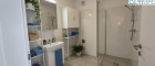 - große Dusche 120 x 90 mit Glaswand, Waschtisch und Spiegelschrank