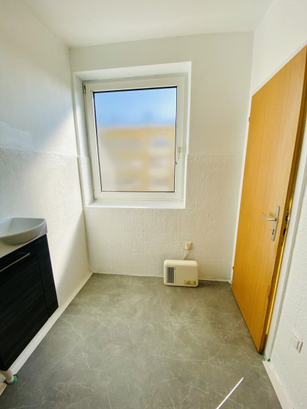 Das Badezimmer wurde bereits ausgeräumt, neu gestrichen und ist bereit für eine individuelle Neugestaltung. Dank des vorhandenen Fensters ist für natürliche Belichtung und Belüftung gesorgt.