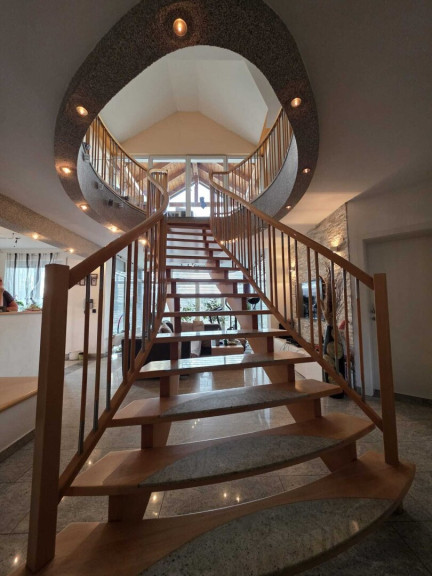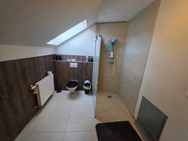 Das Haus verfügt über zwei Badezimmer und zwei separate WCs und ist mit Fliesen sowie Laminatboden ausgestattet. Eine moderne Einbauküche und ein gemütlicher Kamin schaffen ein behagliches Wohnambiente. Die beheizte Fläche wird durch eine effiziente Öl- und Solarenergieanlage umweltfreundlich versorgt.