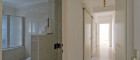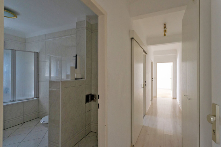 Vom zentralen Vorraum gelangt man linker Hand in das großzügige Bad mit Wanne und WC. Ein Waschmaschinenanschluss ist vorhanden. Die anschließende Küche mit Schiebetüre ist mit Miele-Markengeräten (E-Herd mit Ceranfeld, Kühl-Gefrierkombi, Geschirrspüler) ausgestattet. Ein ca. 8 m² großes Zimmer ist westseitig ausgerichtet.