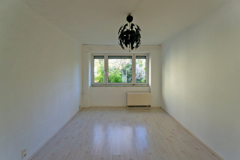 Das besonders helle, freundliche Wohnzimmer mit französchischem Fenster blickt in den schönen Allgemeingarten mit Altbaumbestand. Ein ostseitiges Schlafzimmer komplettiert das Raumangebot.