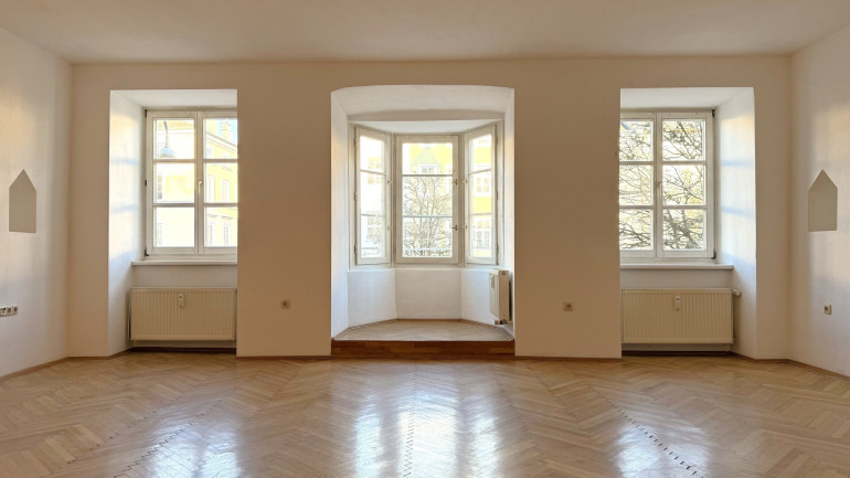 Das Schlafzimmer liegt ruhig auf der vom Stadtplatz abgewandten Seite und verfügt über ein Fenster zum Lichthof. Highlight der Wohnung ist der großzügige und helle Wohnbereich mit großen Fenstern und Blick auf den Stadtplatz.