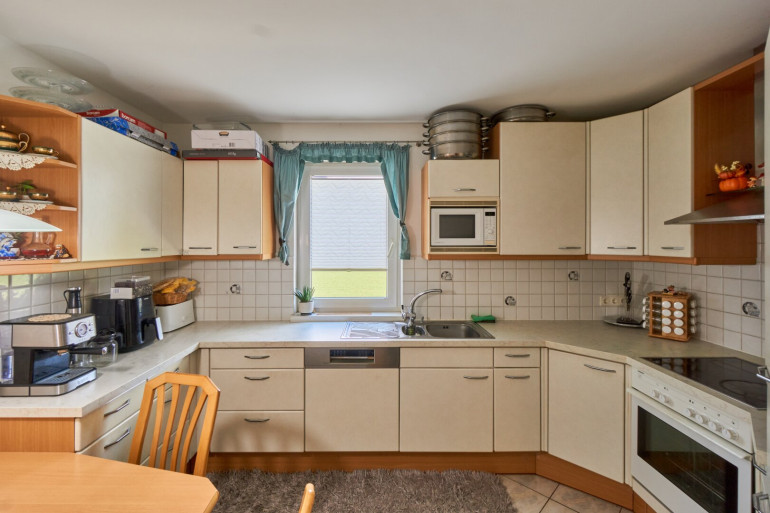 Die Raumaufteilung umfasst eine separate Küche mit Essbereich, ein großzügiges Wohnzimmer sowie zwei Schlafzimmer. Ein Abstellraum, ein Badezimmer mit Badewanne und Dusche sowie ein separates WC mit Waschmaschinenanschluss bieten hohen Alltagskomfort.