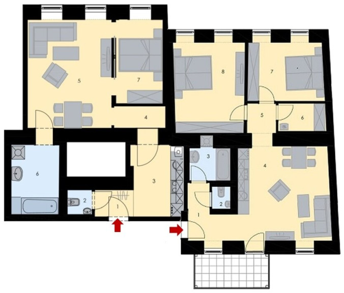 Es handelt sich um 2 nebeneinanderliegenden Wohnungen, die ganz einfach zu verbinden sind.