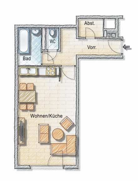 verfügt über ein Wohn/Schlafzimmer mit Kochnische, ein Badezimmer, ein separates WC, einen Abstellraum und