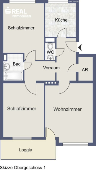 Die 3-Zimmer-Wohnung liegt im Stadtzentrum von Salzburg und besticht durch ihre praktische und übersichtliche Aufteilung. Beim Betreten der Wohnung gelangt man in den Eingangsbereich, von dem aus das Wohnzimmer, die Küche, ein WC und ein Abstellraum erreichbar sind. Über einen Flur gelangt man zu den beiden Schlafzimmern, die beide separat betreten werden können.