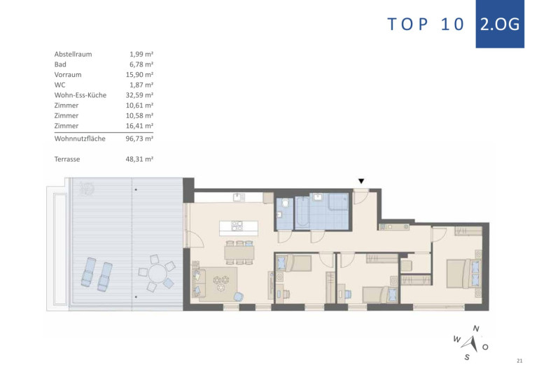 Willkommen in Ihrem neuen Zuhause! Diese perfekt geschnittene 4-Zimmer-Penthouse-Wohnung im 2. OG vereint modernes Design mit höchstem Wohnkomfort. Auf 96,73 m² Wohnfläche erwartet Sie ein lichtdurchflutetes Ambiente, das durch einen große Terrasse (48,31 m²) erweitert wird. Hier genießen Sie sonnige Stunden im Freien und ein behagliches Wohnklima durch Raumhöhen von bis zu 2,65 Metern.