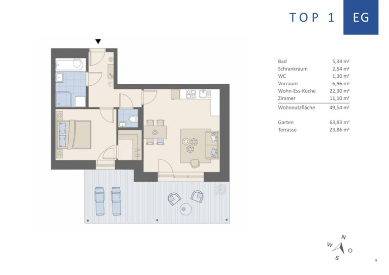 Willkommen in Ihrem neuen Zuhause! Diese perfekt geschnittene 2-Zimmer-Erdgeschoßwohnung vereint modernes Design mit höchstem Wohnkomfort. Auf 49,54 m² Wohnfläche erwartet Sie ein lichtdurchflutetes Ambiente, das durch eine großzügige Terrasse (23,86 m²) und einen eigenen Privatgarten (63,83 m²) erweitert wird. Hier genießen Sie sonnige Stunden im Freien und ein behagliches Wohnklima durch Raumhöhen von bis zu 2,65 Metern.