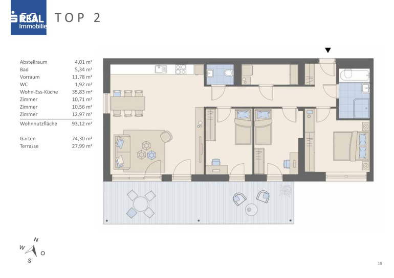 Willkommen in Ihrem neuen Zuhause! Diese perfekt geschnittene 4-Zimmer-Erdgeschoßwohnung vereint modernes Design mit höchstem Wohnkomfort. Auf 93,12 m² Wohnfläche erwartet Sie ein lichtdurchflutetes Ambiente, das durch eine großzügige Terrasse (27,99 m²) und einen eigenen Privatgarten (74,30 m²) erweitert wird. Hier genießen Sie sonnige Stunden im Freien und ein behagliches Wohnklima durch Raumhöhen von bis zu 2,65 Metern.
