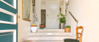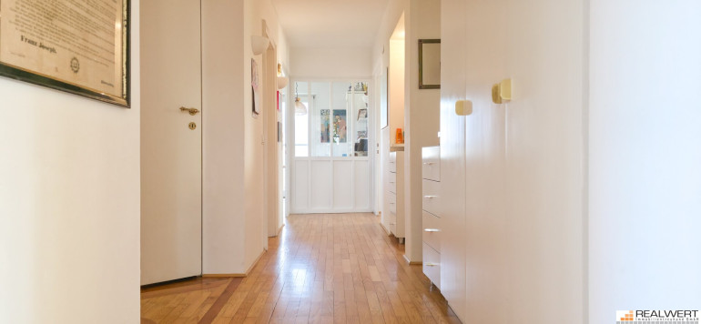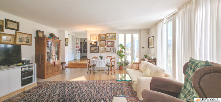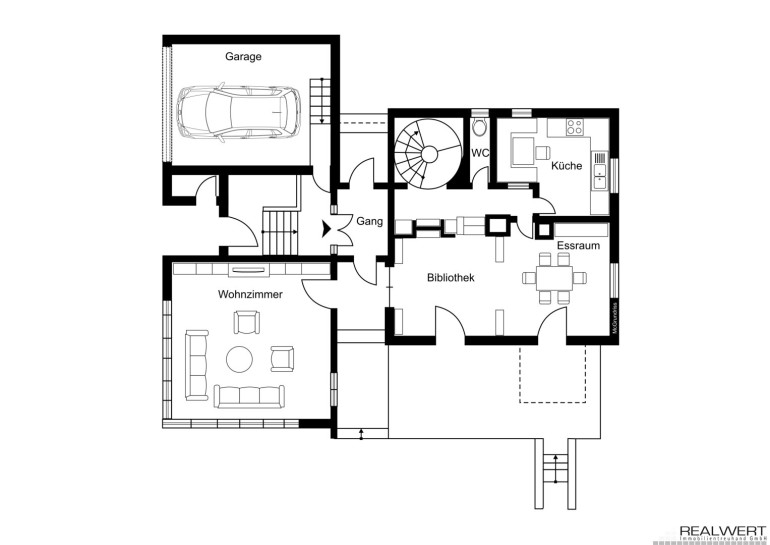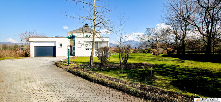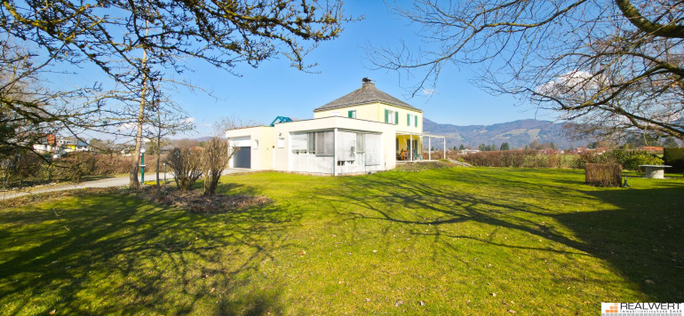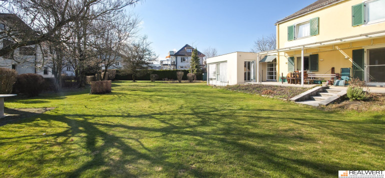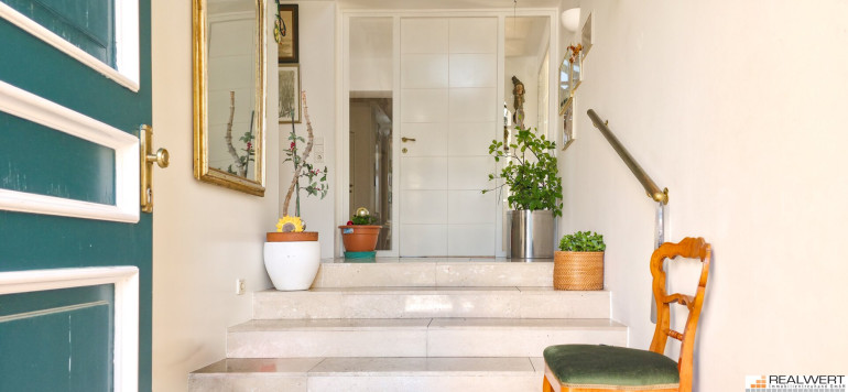 Im Erdgeschoss betritt man das Objekt über einen, zwischen Garage und Wohnzimmer angelegten, dachverglasten Korridor. Hier befinden sich die Garderobe und ein direkter Zugang zur Garage. Über wenige Stufen gelangt man anschließend in die Diele des Haupthauses, von welcher sich alle weiteren Räume erschließen. Das Wohnzimmer hat eine sehr ansprechende Größe von fast 40m2 und befindet sich wiederum im Zubau, wodurch ein interessanter Niveauunterschied im Haus geschaffen wurde. Wieder im Ursprungsobjekt angelangt, erreicht man über eine heimelige Bibliothek das Esszimmer sowie die direkt angeschlossene Küche. Vom Esszimmer aus erschließt sich ebenfalls auch der Zugang auf die große Südterrasse des Hauses.