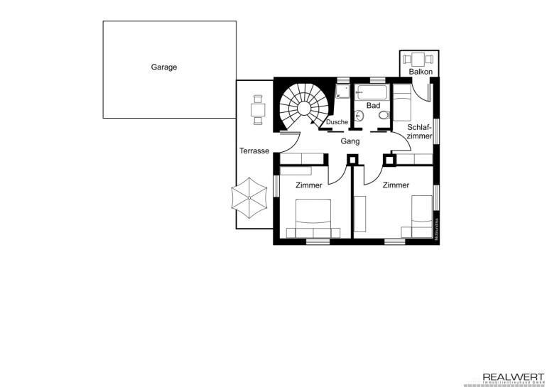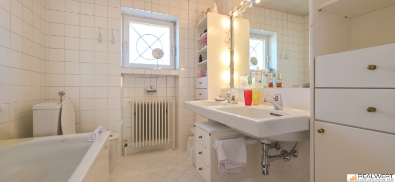 Parkett, Fliesen, Steinboden, Öl, Zentralheizung, Einbauküche, Nordbalkon, Bad mit Fenster, Badewanne, Dusche, Garage