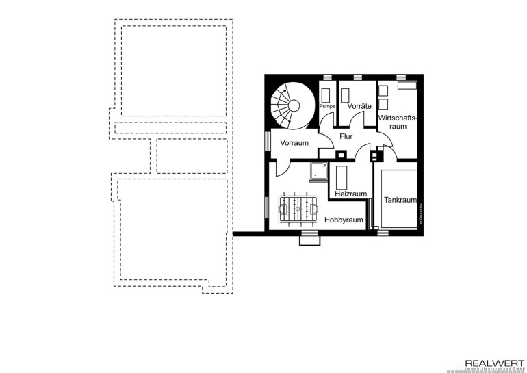 Das Kellergeschoß ist pragmatisch angeordnet. Es verfügt über Räume für die Haustechnik (Heizraum und Tankraum), sowie einen Wirtschaftraum. Ein weiterer Raum wird als Lager und Hobbyraum genutzt.