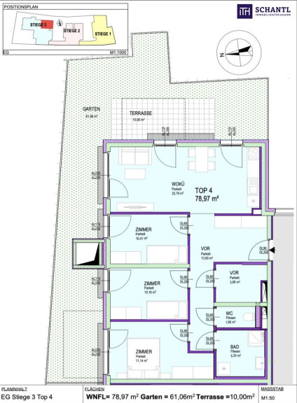 Wohnfläche: ca. 78,97 m² + Terrasse: ca. 10 m² + Garten: ca. 61,06 m² + Kellerabteil