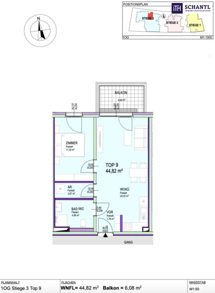 Wohnfläche: ca. 44,82 m² + Balkon: ca. 6,08 m² + Kellerabteil