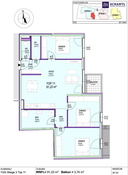 Wohnfläche: ca. 91,23 m² + Balkon: ca. 3,74 m² + Kellerabteil