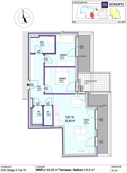 Wohnfläche: ca. 64,50 m² + Terrasse: ca. 8,40 m² + Kellerabteil