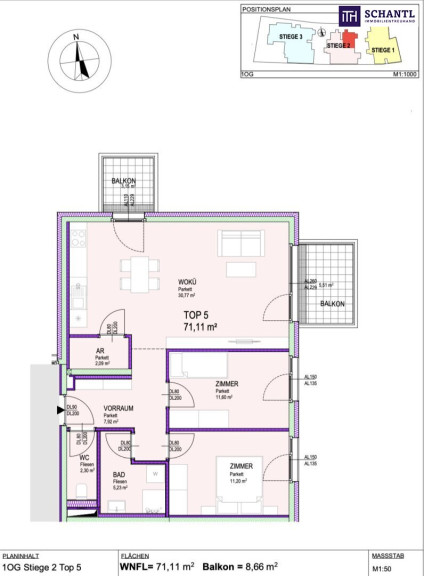 Wohnfläche: ca. 71,11 m² + 2 Balkone: ca. 8,66 m² + Kellerabteil