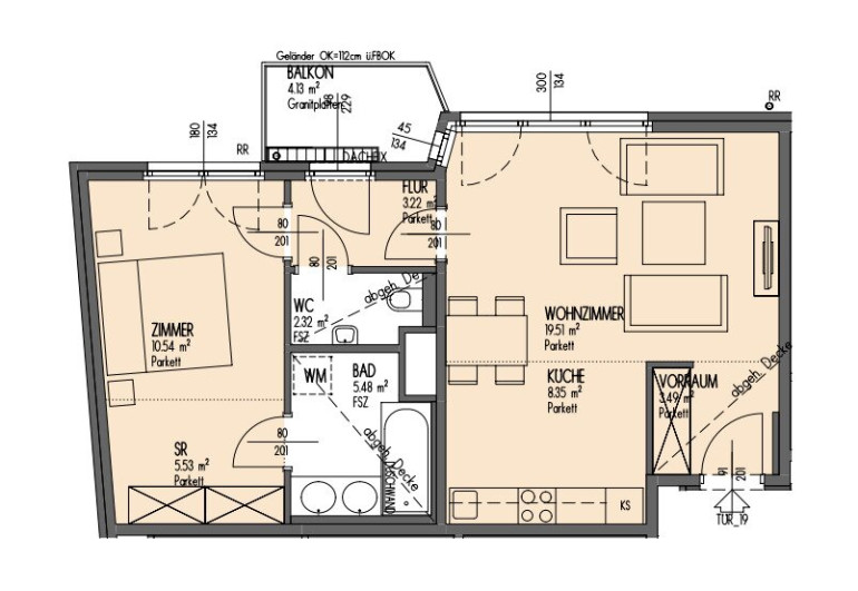Top 19: Diese wunderschöne 58m² große Neubauwohnung gliedert sich in einen großzügigen Wohnbereich mit Einbauküche, einen Flur mit Ausgang auf den Balkon, ein großzügiges Schlafzimmer mit en suite Badezimmer, ein getrenntes WC und einen Vorraum.