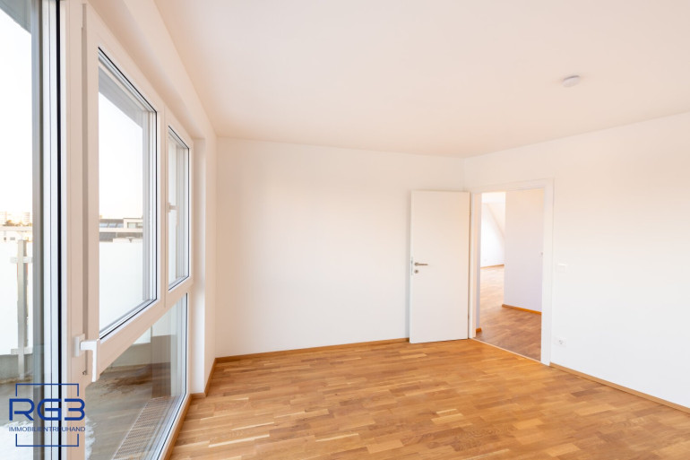 Geradeaus öffnet sich der Wohnbereich. Hier geht der Küchenraum fließend in das großzügige Wohnzimmer über. Der Raum ist angenehm geplant, hell und sehr gut möblierbar. Vom Schlafzimmer gelangen Sie direkt auf die Loggia mit einem wunderbaren Blick in den Südwesten Richtung Alte Donau, zu der Sie nur ca. 170m Gehweg haben.