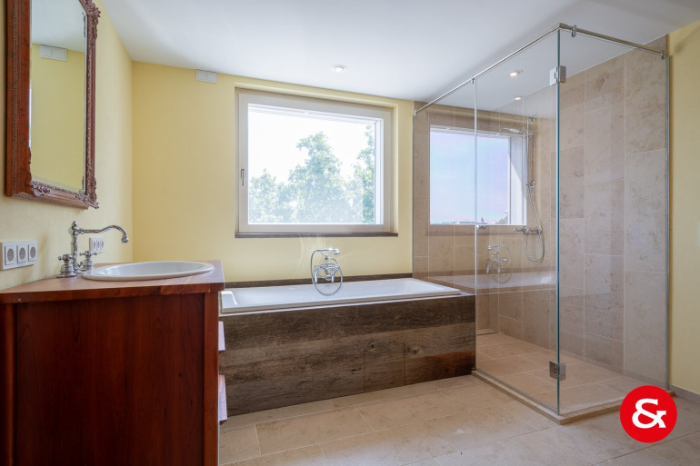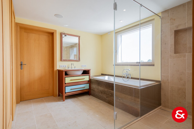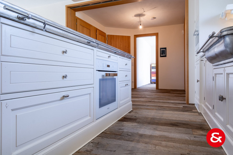Die offene Küche, die mit allen nötigen Geräten ausgestattet ist, ermöglicht ständigen Kontakt mit Ihren Gästen. Auch die 2 Bäder und 2 WCs bieten Ihnen viel Komfort und sind mit hochwertigen Fliesen und Steinböden ausgestattet.