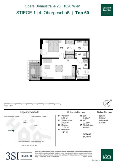 Diese moderne Wohnung befindet sich im 4. Obergeschoß. Die Einheit verfügt über eine Wohnnutzfläche von insgesamt 54,04 m² und bietet zusätzlich einen ca.6,23 m² großen Balkon.