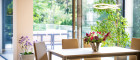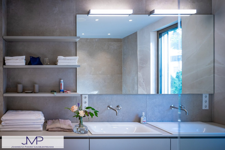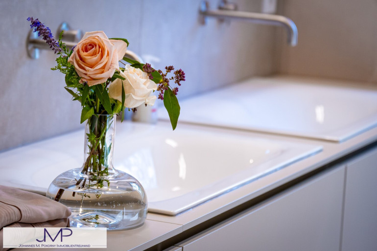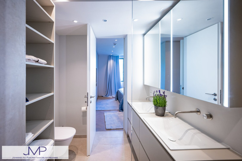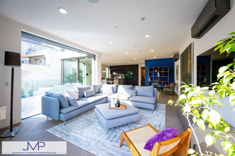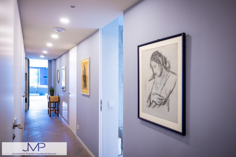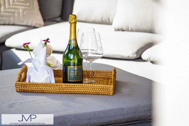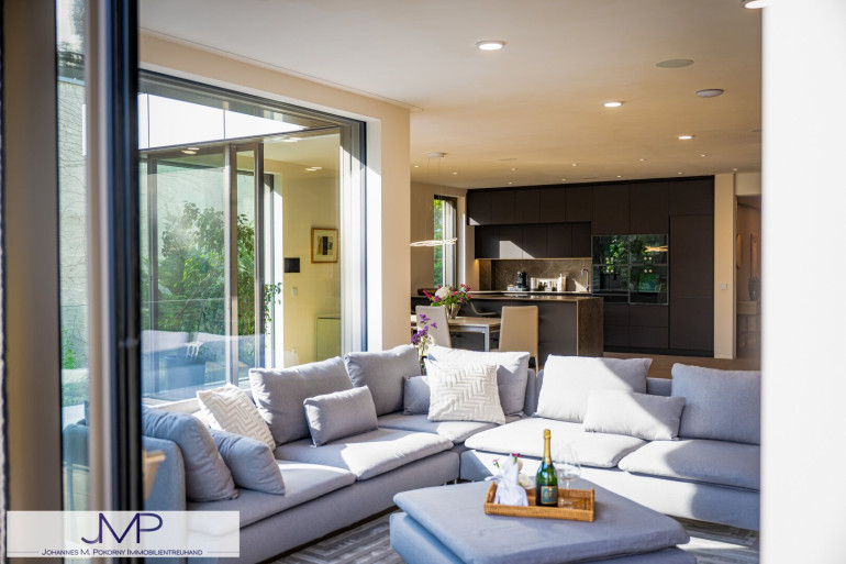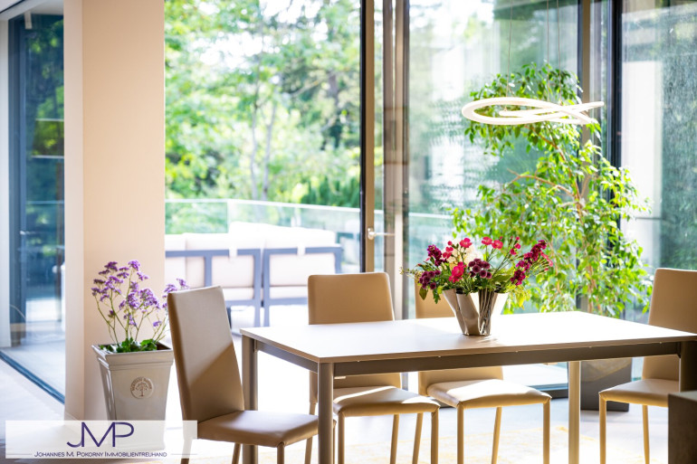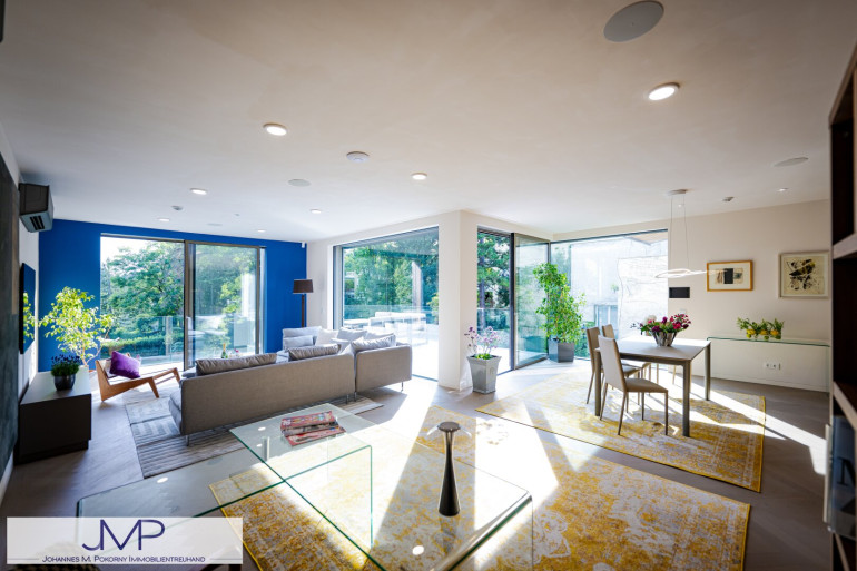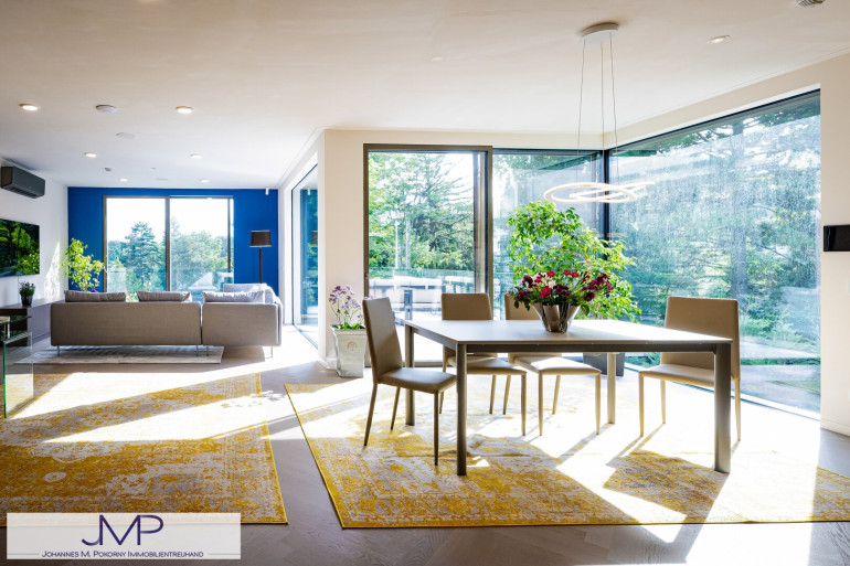 Der etwa 73 m² große Wohn- und Essbereich bildet dabei das Herzstück der Wohnung. Eine elegante Glasfront führt auf die rund 28 m² große, südseitige Terrasse, von der aus sich ein schöner Blick in die weitläufige, parkähnliche Gartenanlage eröffnet. Dort befinden sich ein ca. 6 × 12 m großes Outdoor-Pool mit einem etwa 28 m² großen Poolhouse – ein stilvoller Rückzugsort für warme Tage.