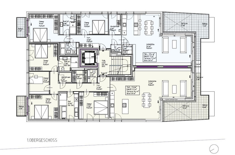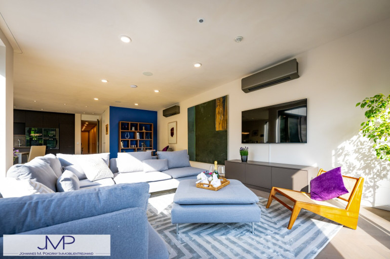 Die Wohnung befindet sich im erhöhten ersten Obergeschoss eines erst 2023 fertiggestellten, äußerst repräsentativen High-End-Objekts. Sie wirkt dank ihrer Ausrichtung sehr freundlich und hell und bietet auf rund 173 m² einen durchdachten Grundriss mit fünf großzügigen Zimmern.