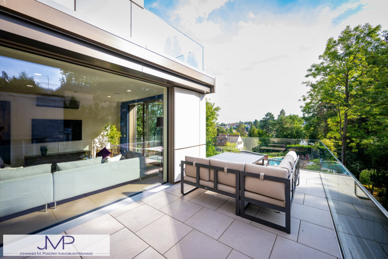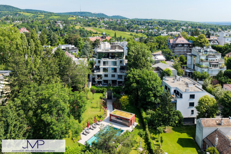 Das parkähnliche Grundstück liegt herrlich ruhig auf einem sanft geneigten Südhang im Pötzleinsdorfer Cottage, direkt an der Grenze zum 19. Bezirk.
