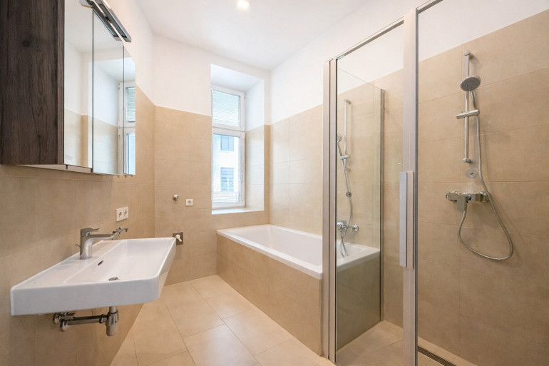 - Badezimmer mit Badewanne, Dusche und Fenster