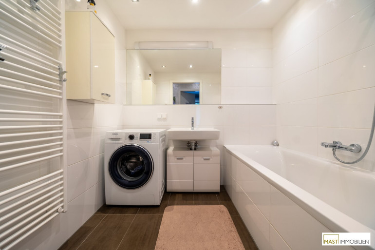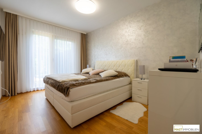 Nach Eintritt in die Wohnung gelangen Sie in ein großzügiges Vorzimmer mit einer Fläche von knapp 7 m² dass Ihnen ausreichend Platz für Ihre Garderobe bietet. Im Anschluss befindet sich das Elternschlafzimmer mit ca. 14,20 m² und das Kinderzimmer dass sich auch optimal als Gästezimmer oder Büro eignet mit einer Fläche von ca. 11,30 m². Gegenüber dieser beiden Zimmer befinden sich die Nassräume, 1x das separat begehbare WC inkl. Handwaschbecken und das modern und exklusiv ausgestattete Bad mit einer Wanne, Waschbecken & WM-Anschluss. Das Wohnzimmer inkl. einer Einbauküche verfügt über sämtlich relevanten Geräte. Direkt neben der Küche ist ein ca. 2,50 m² großer Abstellraum.