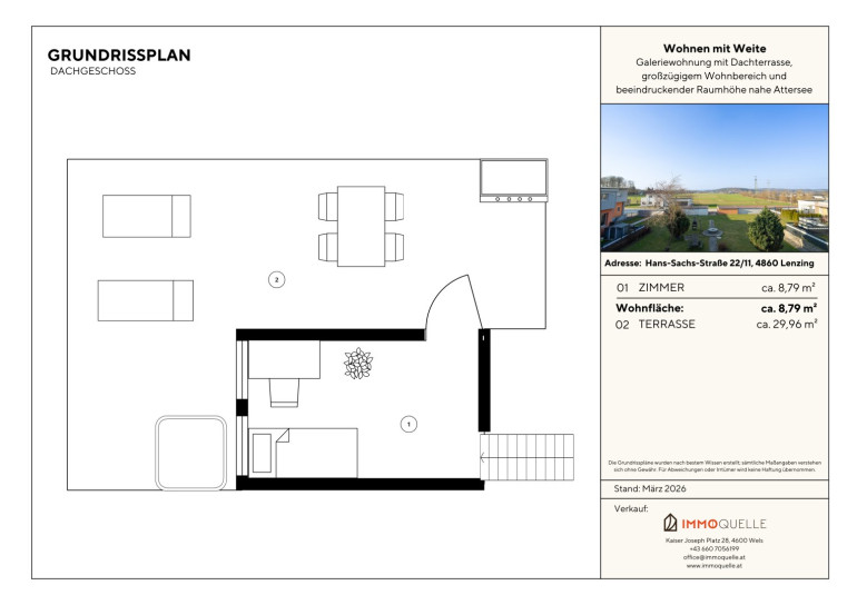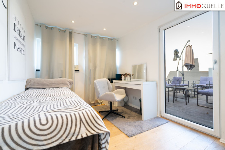 Von hier aus öffnet sich auch der Zugang zur rund 30 m² großen Dachterrasse. Ergänzt wird dieser Bereich durch ein weiteres Zimmer, das sich flexibel nutzen lässt und zusätzliche Möglichkeiten für individuelle Wohnideen eröffnet. Die Dachterrasse selbst ist ein Ort zum Durchatmen, Ankommen und Genießen. Mit ihrem schönen Blick, stimmungsvollen Sonnenuntergängen und der angenehmen Privatsphäre wird sie schnell zum Lieblingsplatz dieser Wohnung. Ob bei einem entspannten Ausklang des Tages, in geselliger Runde oder bei wohltuenden Stunden im Whirlpool - dieser Rückzugsort schenkt Ihnen Momente, die sich wie ein kleiner Urlaub über dem Alltag anfühlen.