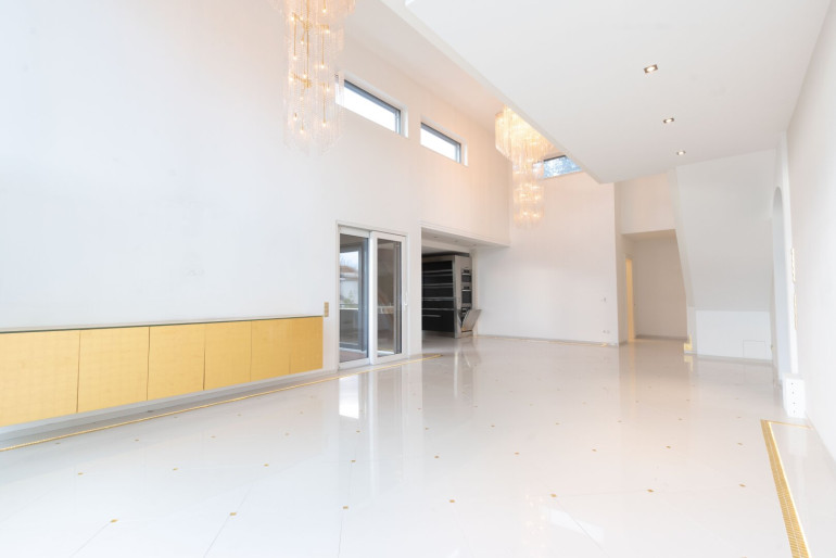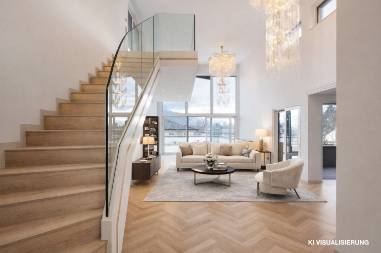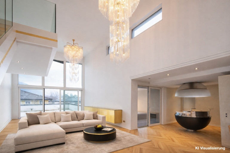 Das Herzstück bildet der rund 70 m² große Wohn-, Ess- und Küchenbereich – ein repräsentativer Lebensraum mit außergewöhnlicher Raumhöhe, bodentiefen Fensterflächen und fließenden Übergängen. Exquisite Materialien wie hochwertiges Feinsteinzeug mit goldenen Akzenten, ausgewählte Lichtinstallationen sowie eine Designküche mit markanter Kochinsel setzen eindrucksvolle Akzente und verleihen dem Raum eine unverwechselbare Signatur. Ein weiteres Highlight ist die Galerieebene mit Zugang zur privaten Dachterrasse (ca. 26 m²) – ein Rückzugsort mit höchstem Maß an Exklusivität.
