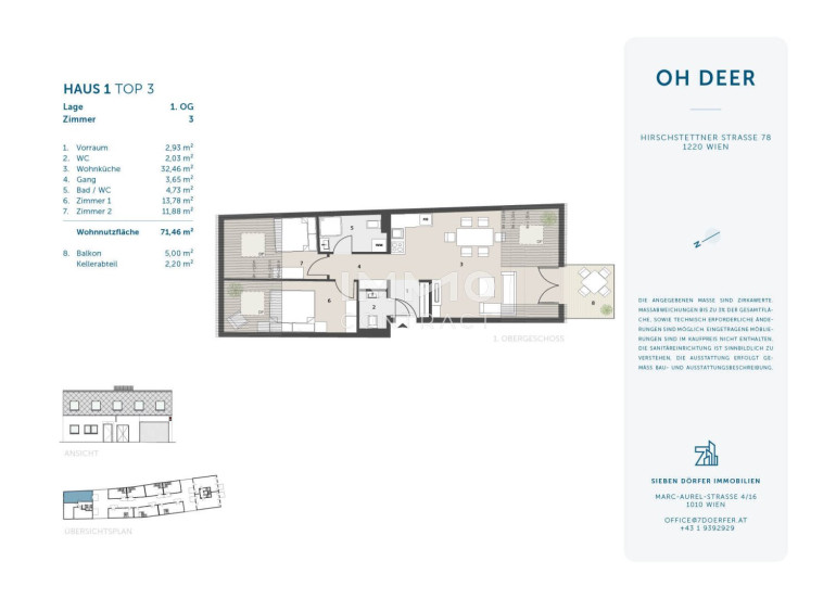 Im attraktiven Neubauprojekt „OH DEER“ in der Hirschstettner Straße 78 gelangt diese hervorragend geschnittene 3-Zimmer-Eigentumswohnung im 1. Obergeschoss zum Verkauf. Die Einheit überzeugt mit rund 71,46 m² Wohnnutzfläche, einer großzügigen Wohnküche mit ca. 32,46 m², zwei gut vermietbaren Schlafzimmern, Balkon mit ca. 5,00 m² sowie Kellerabteil. Der durchdachte Grundriss, die moderne Ausstattung und die gefragte Wohnlage in der Donaustadt machen diese Wohnung besonders interessant für Anleger, die auf nachhaltige Vermietbarkeit, Wertstabilität und zeitgemäße Wohnqualität setzen.