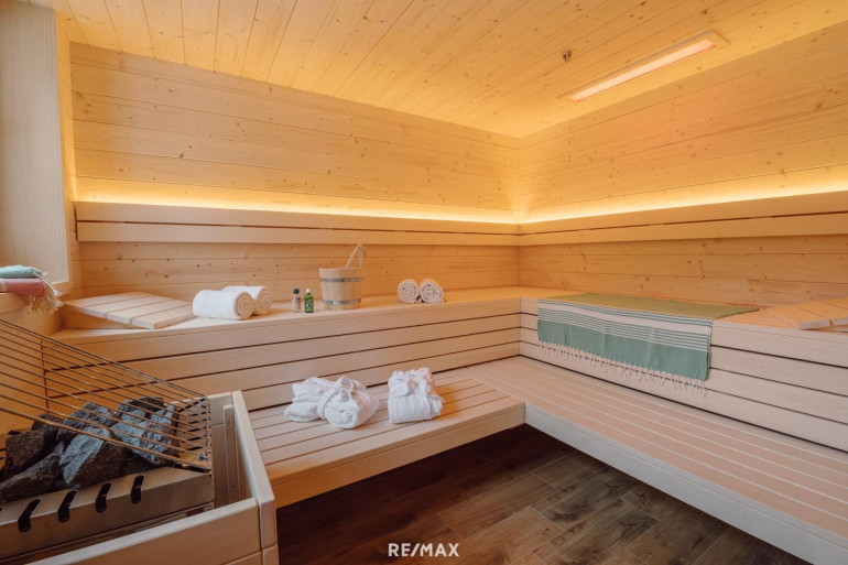 - Saunahaus, direkt mit dem Gebäude verbunden und über das Badezimmer im Erdgeschoss zugänglich – Wellness pur nach einem aktiven Tag