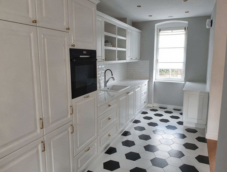 Parkett, Etagenheizung, Fußbodenheizung, Heizofen, Einbauküche