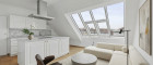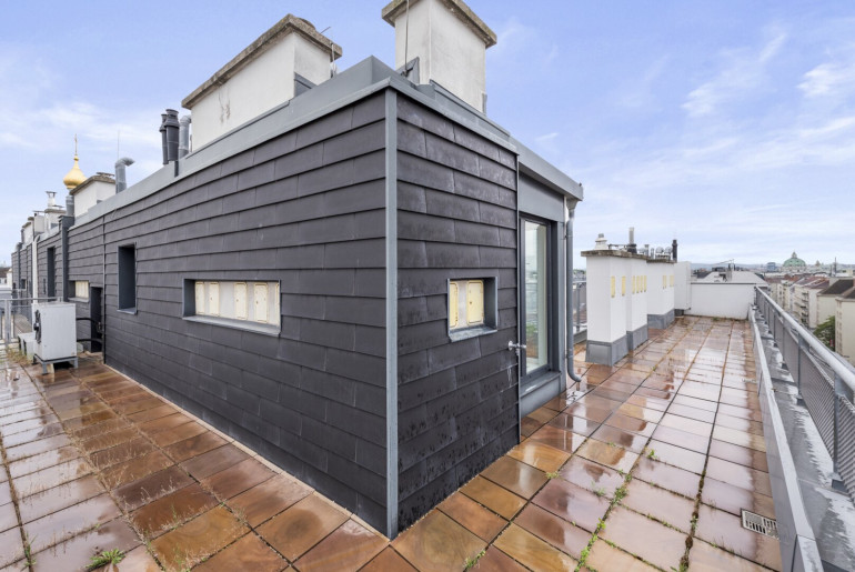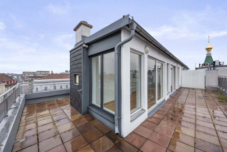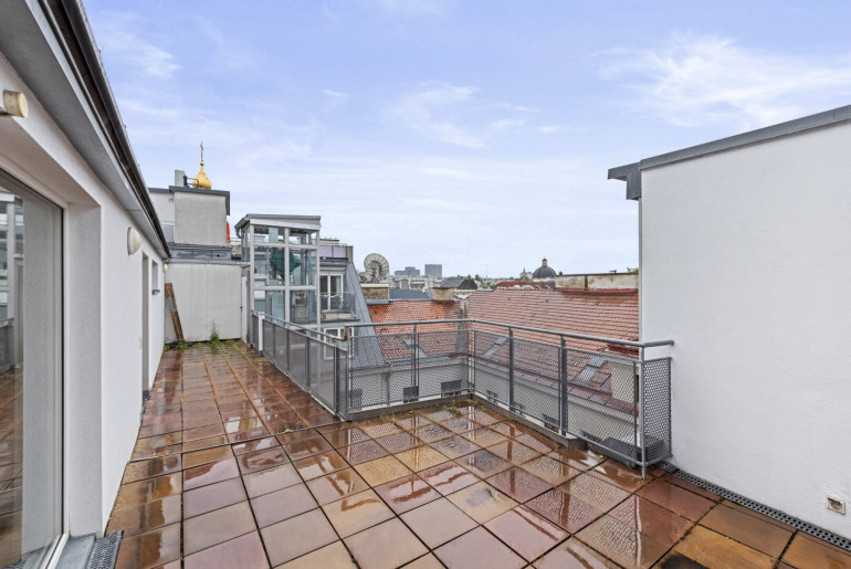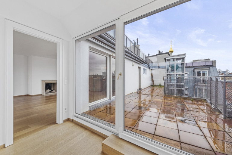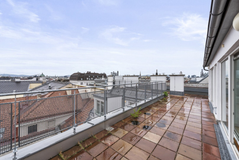 Direkter Ausgang auf die ca. 85 m2 große Dachterrasse mit atemberaubendem Blick über die Dächer Wiens