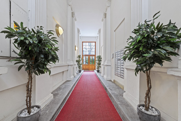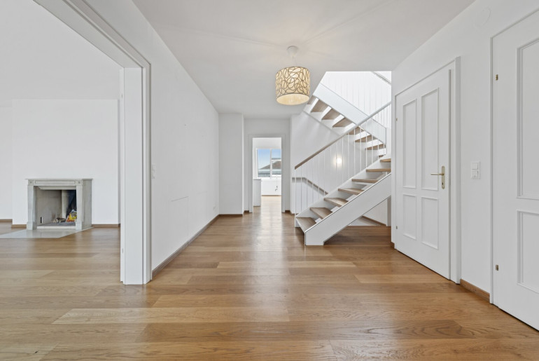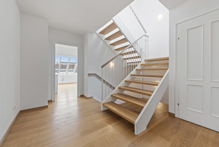 Ein einladender Vorraum bildet den ersten Zugang zur Wohnung. Von hier führt eine elegante Innentreppe in die darüberliegende Hauptebene.
