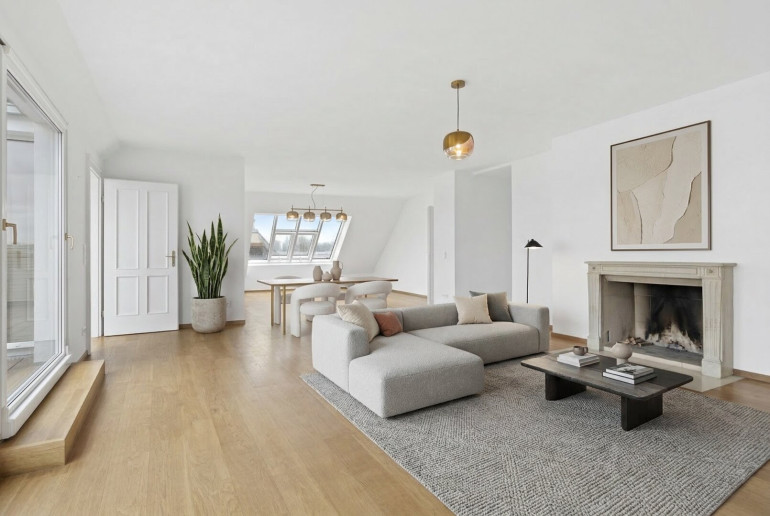 -Wohnsalon (ca. 62 m2) mit offenem Kamin und direktem Zugang zur ca. 30 m2 großen westseitigen Terrasse