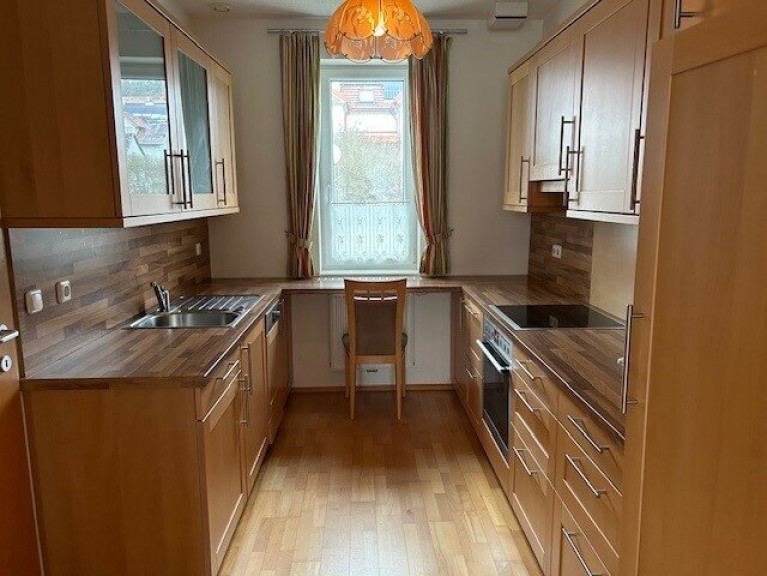 Fliesen, Parkettboden, Zentralheizung, Einbauküche, Südbalkon, Bad mit Fenster, Badewanne, Garage, Parkplatz