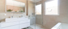 Bad: Privates Tageslicht-Badezimmer mit moderner Dusche, Doppelwaschtisch und Toilette – Luxus pur mit Blick ins Grüne